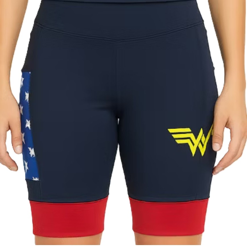 Bermuda ciclista para esportes mulher maravilha com bolsos nas laterais, cós largo, tecido com elastano, toque macio não fica transparente
