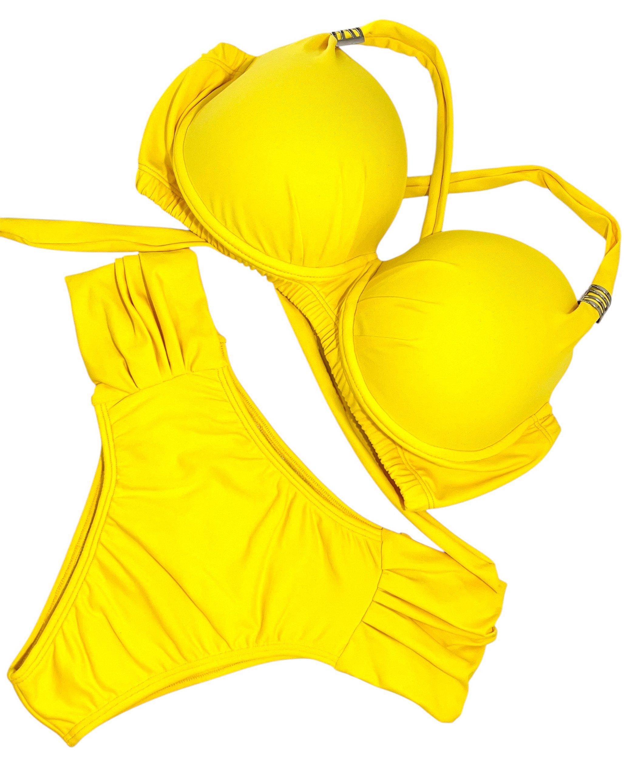 Conjunto Biquíni, parte de baixo modelo borboleta forrado frente e costas, parte de cima meia taça com bojo, alças largas com três formas de uso.