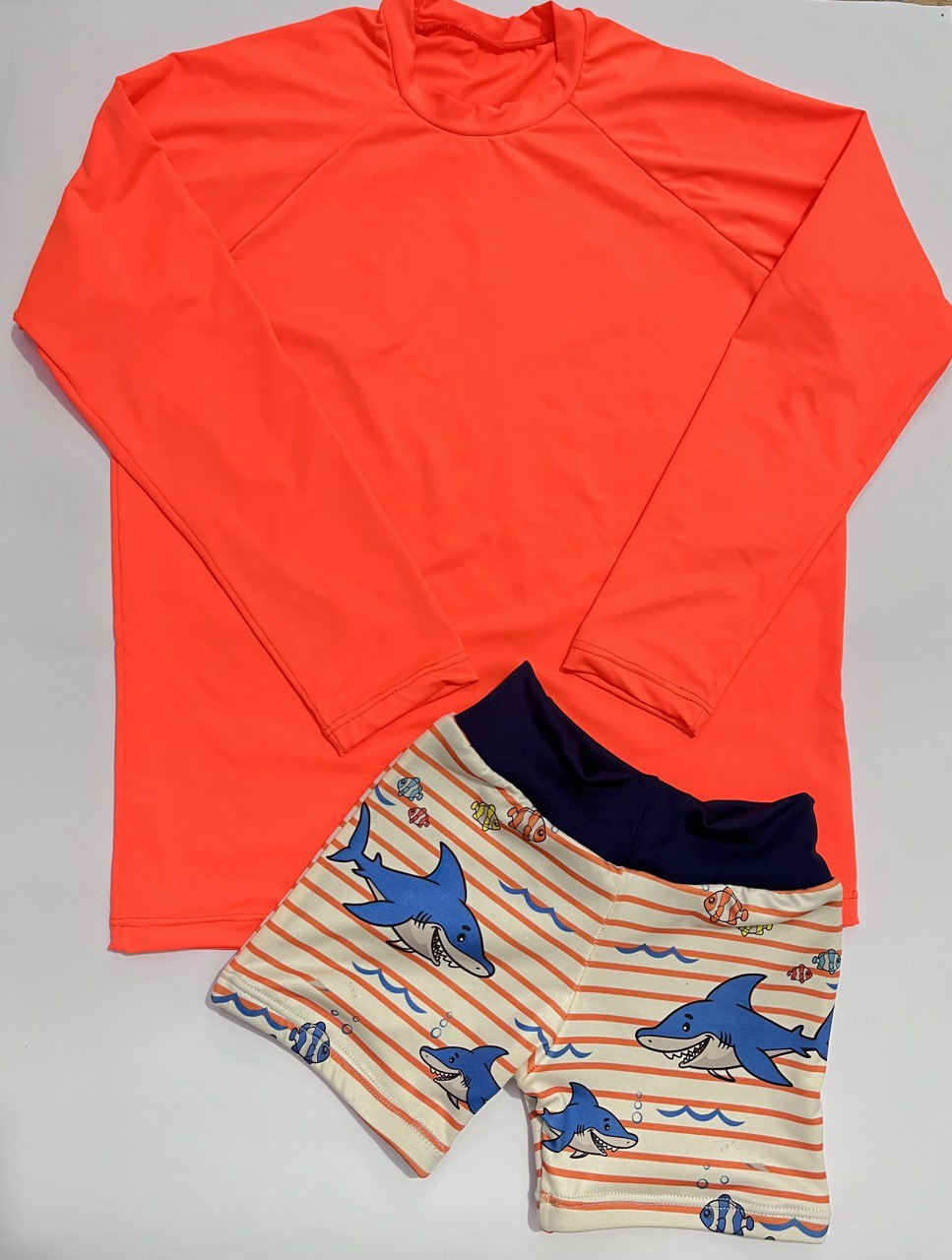 kit camisa UV +50 em Poliamida e sunga infantil tipo shortinho com forro na frente e costas, com cordão para regulagem na cintura.